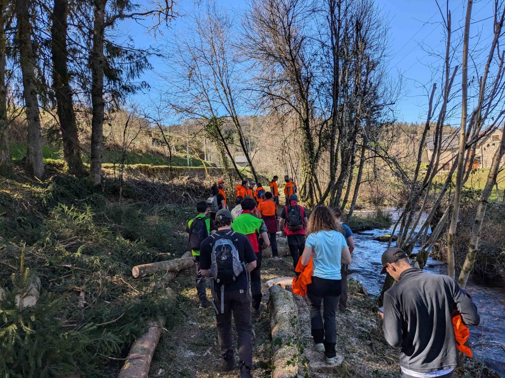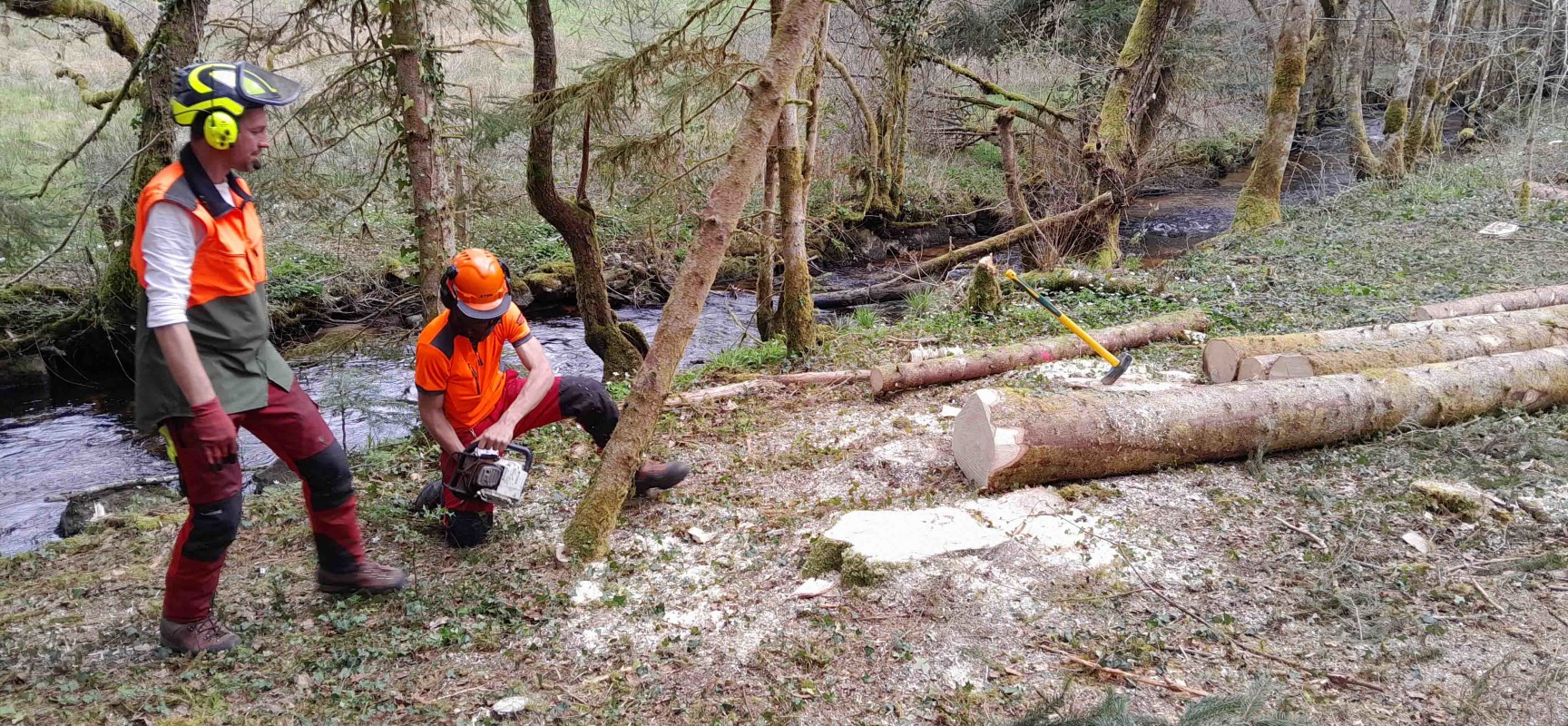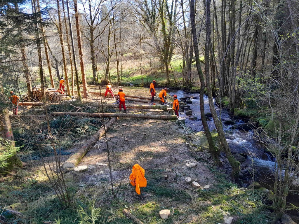 La classe de seconde NJPF* de l’école forestière de Meymac a été mobilisée en procédant à un abattage manuel des arbres. Le bois treuillé a été stocké en bord de route, afin qu’il puisse être valorisé par le propriétaire. Cette opération a offert une expérience de terrain précieuse et également permis de sensibiliser ces futurs professionnels de la filière bois à la protection des milieux aquatiques.