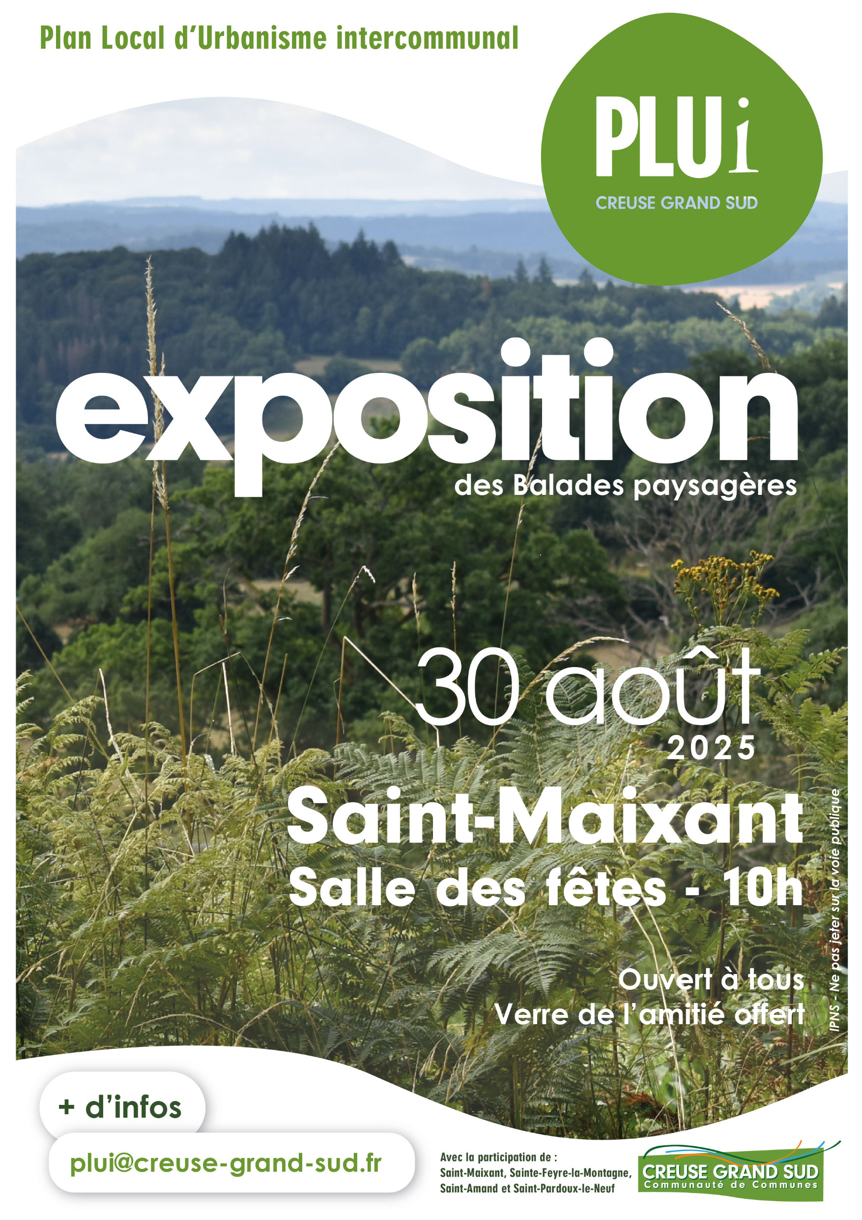 Une exposition de ces balades, en présence de Valérie Bertin et Claude Bialoux, respectivement Présidente et Vice-président en charge du PLUi de la Communauté de communes Creuse Grand Sud, aura lieu samedi 30 août, de 10h à 11h30, à la salle polyvalente de Saint-Maixant. Elle est ouverte à toutes et tous.