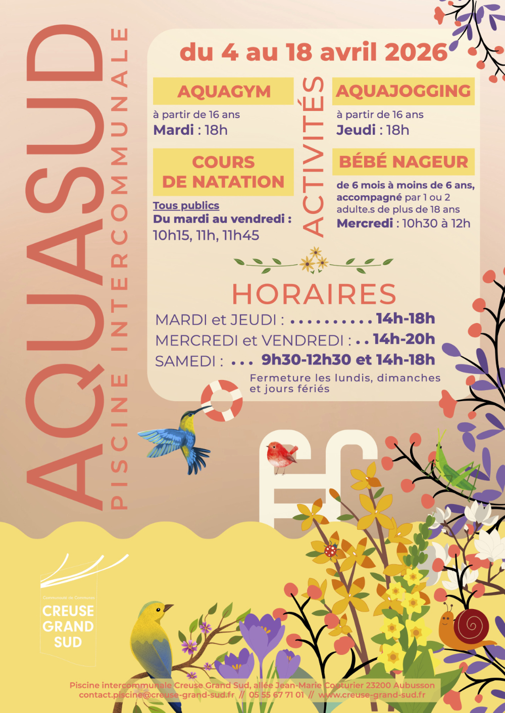 [Piscine AQUASUD] Horaires et activités pendant les vacances de Printemps 30 Views mars 26, 2026 Actualités , Habiter ici Horaires et activités pendant les vacances de Printemps ! du samedi 4 avril au samedi 18 avril 2026 Fermeture les lundis, dimanches et jours fériés