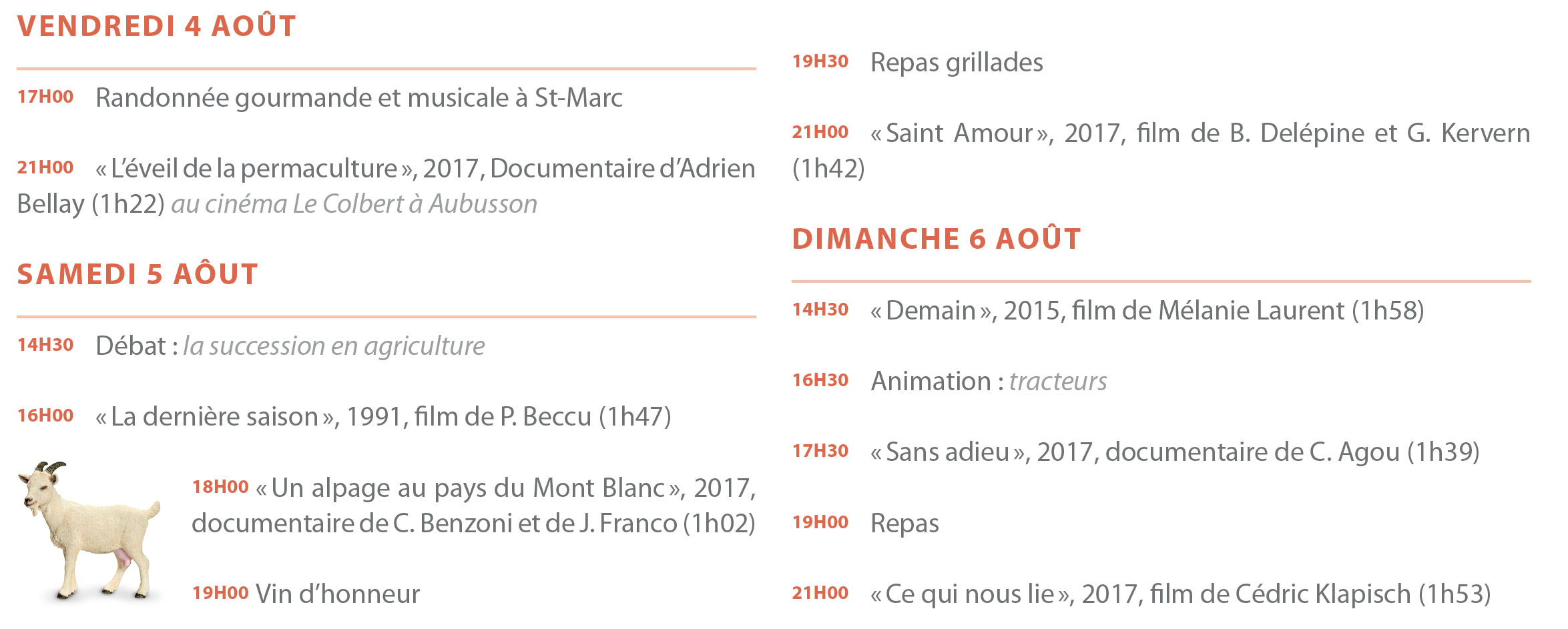 > 21h – En partenariat avec le cinéma Le Colbert, à Aubusson : « L’éveil de la permaculture », documentaire d’Adrien Bellay (82’ – 2017). Pour d’autres formes d’agricultures, respectueuses de l’environnement, économiquement viables et socialement équitables.