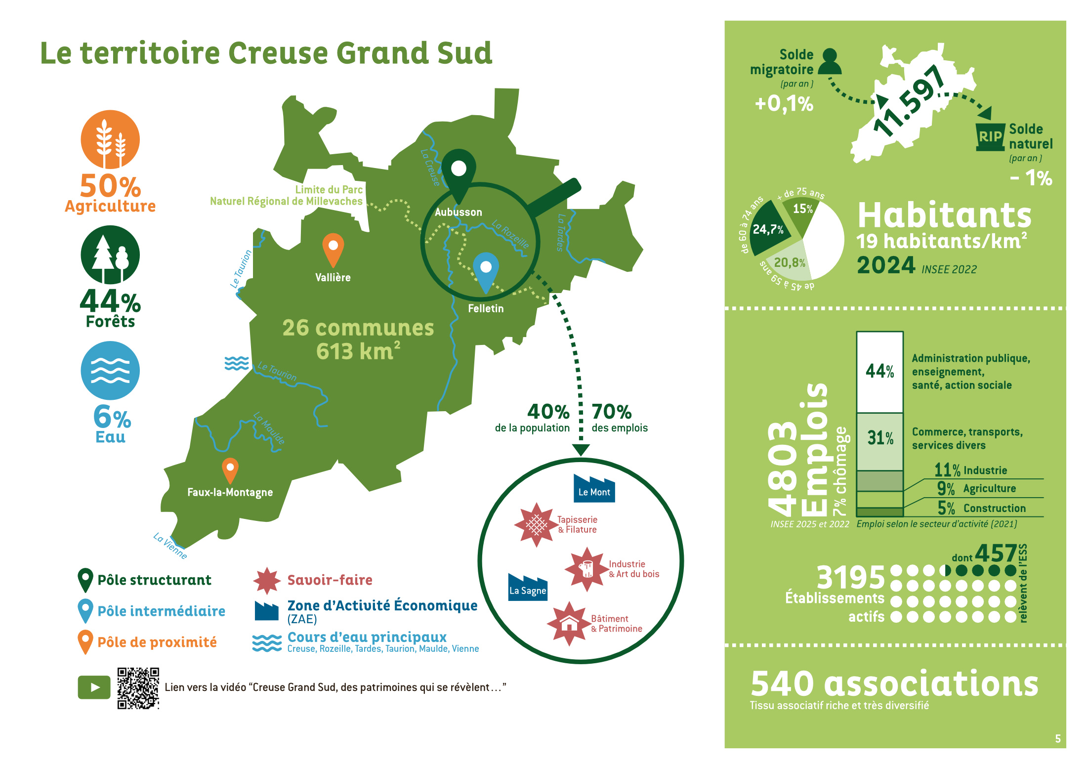 26 communes constituées de multiples villages rythment un territoire vivant et doux à la fois, propice à l’épanouissement de vos idées et à la créativité. Le sud de la Creuse est organisé autour des pôles structurants d’Aubusson (Sous-Préfecture), Felletin, Vallières, et Faux-la-Montagne.